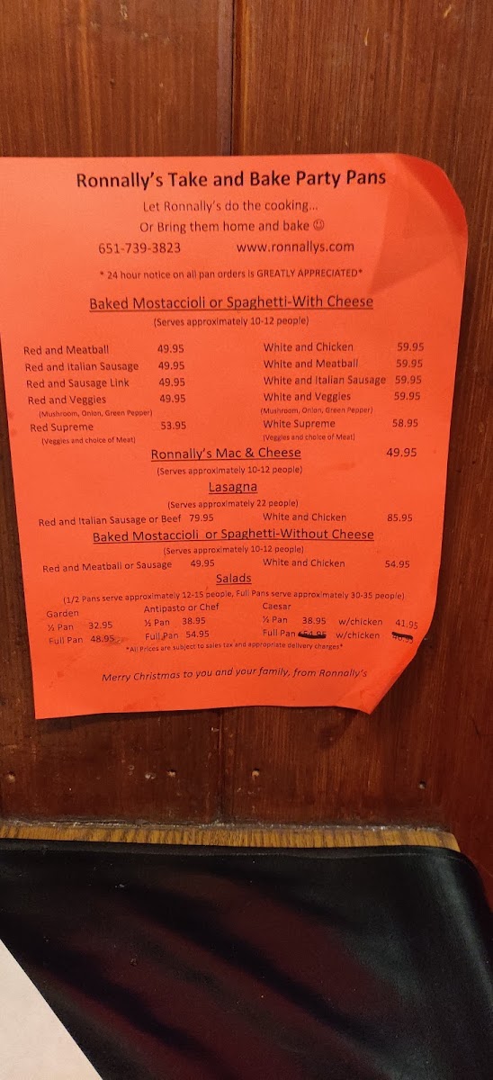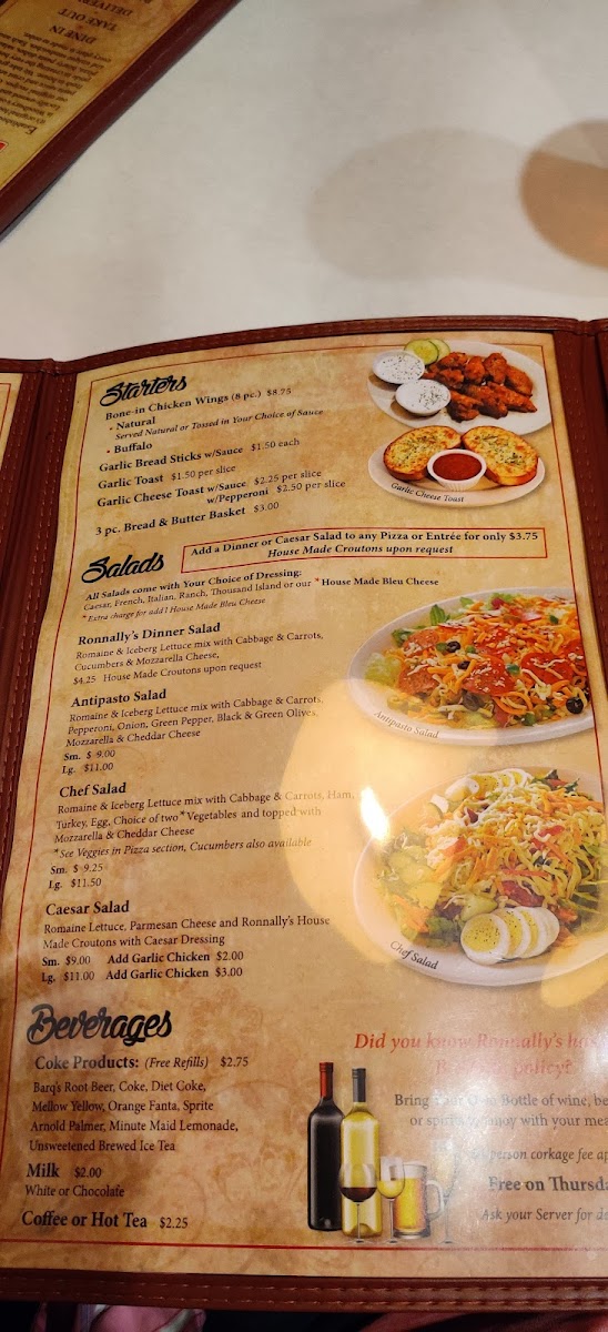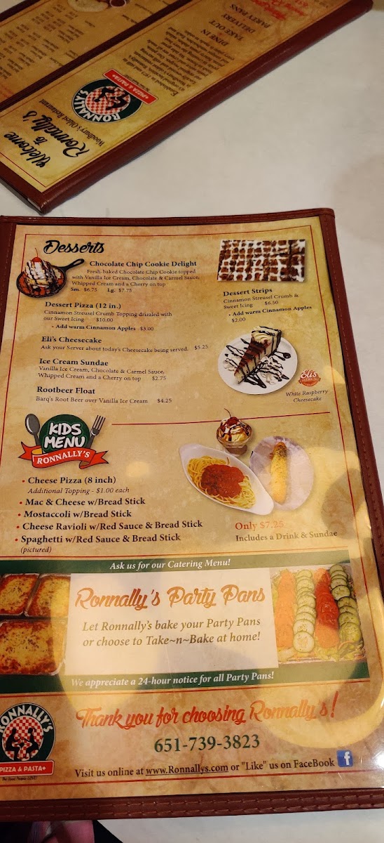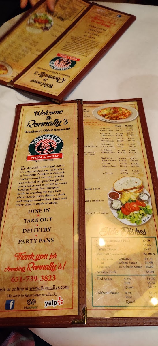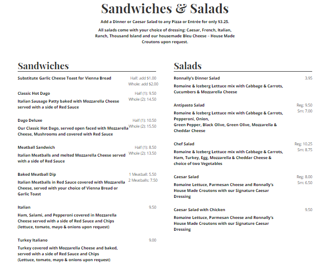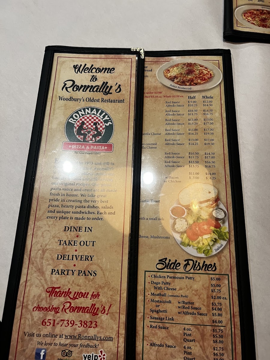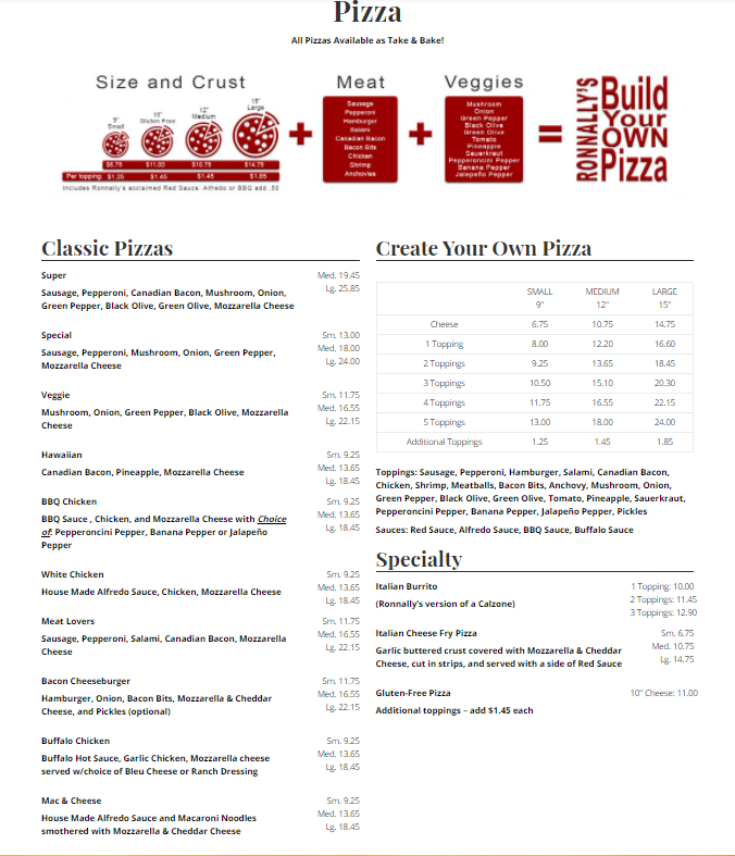Ronnally's Pizza and Pasta Menu