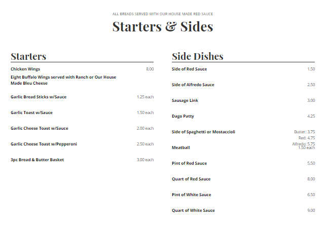 Complementing the menu are classic sides like fall-off-the-bone buffalo wings and fresh-baked breads, made to pair well with the range of pizzas or pasta selections. For those looking to indulge, there are also simple treats like ice cream or cinnamon-infused desserts to round out the meal.