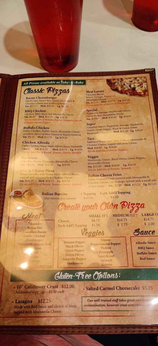 The menu features a variety of familiar favorites like hearty calzones, comforting spaghetti with meatballs, and creative specialty pizzas such as Chicken Pineapple or Taco Pizza. Light yet flavorful salads and fresh garlic cheese bread provide excellent starters, while warm desserts like the Melting Cookie Delight offer a cozy finish to the meal.